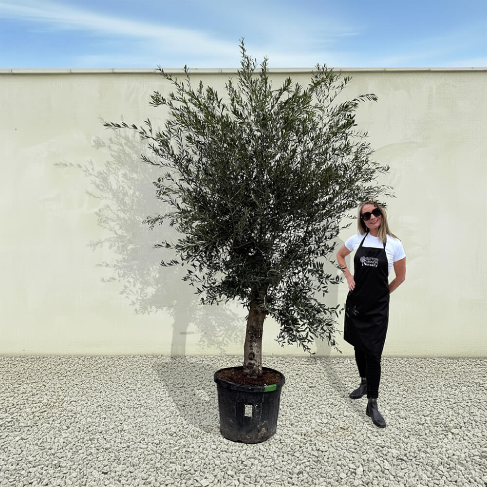 The tree shown in the photo is the exact tree you’ll receive on delivery day. Hand‑selected by the owner of Sutton Manor, this stunning Spanish olive tree was chosen for its exceptionally thick trunk and impressive, full crown. It makes a striking statement whether planted directly into the ground or showcased in one of our elegant pots.