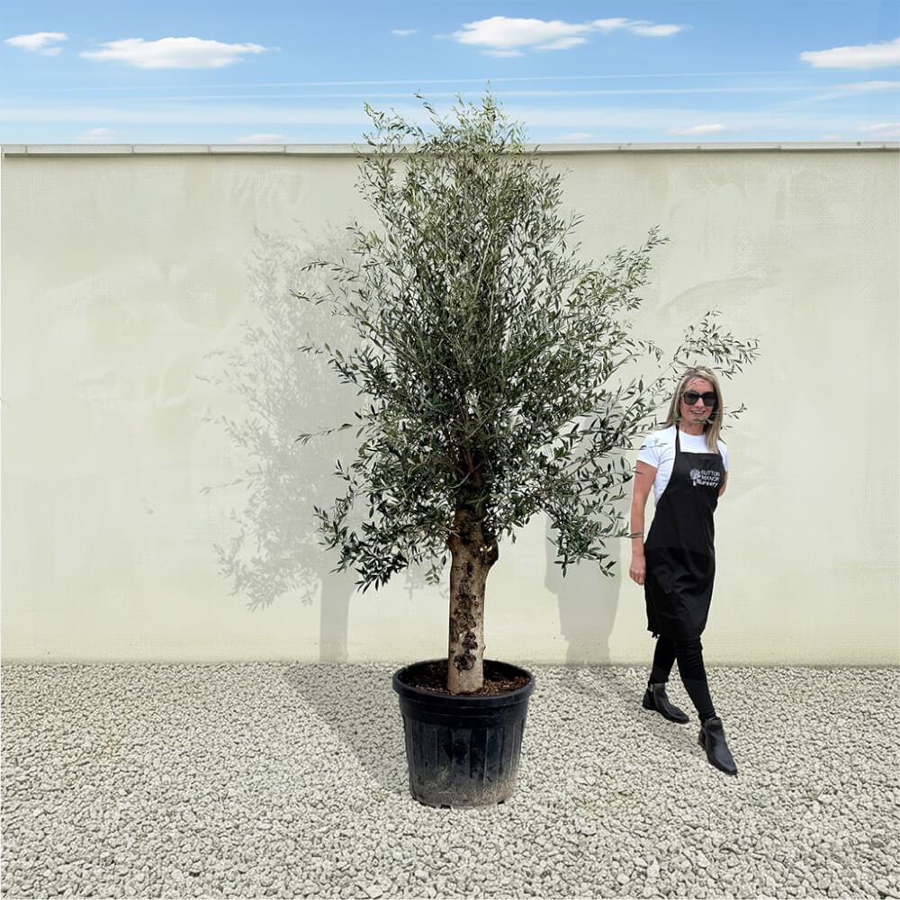 The tree shown in the photo is the exact tree you’ll receive on delivery day. Hand‑selected by the owner of Sutton Manor, this stunning Spanish olive tree was chosen for its exceptionally thick trunk and impressive, full crown. It makes a striking statement whether planted directly into the ground or showcased in one of our elegant pots.
