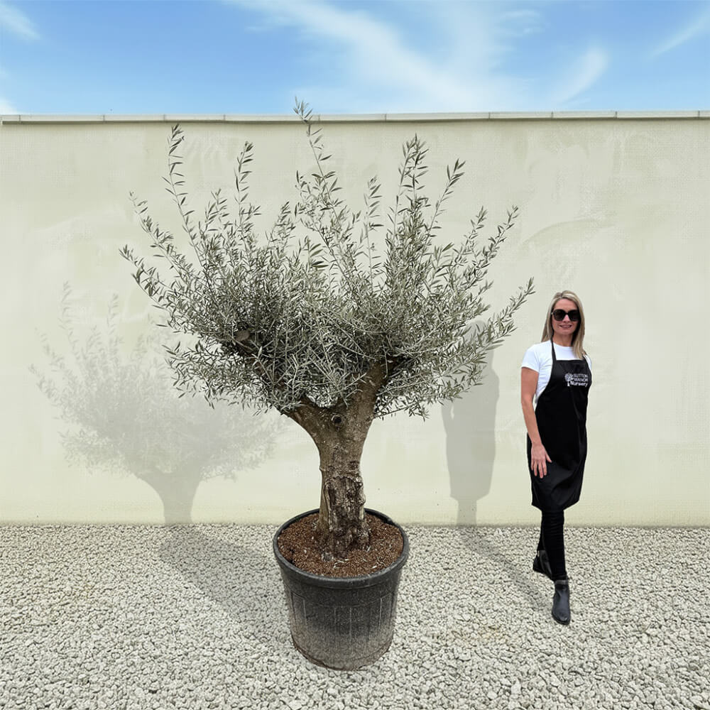 The tree shown in the photo is the exact tree you’ll receive on delivery day. Hand‑selected by the owner of Sutton Manor, this stunning Spanish olive tree was chosen for its exceptionally thick trunk and impressive, full crown. It makes a striking statement whether planted directly into the ground or showcased in one of our elegant pots.