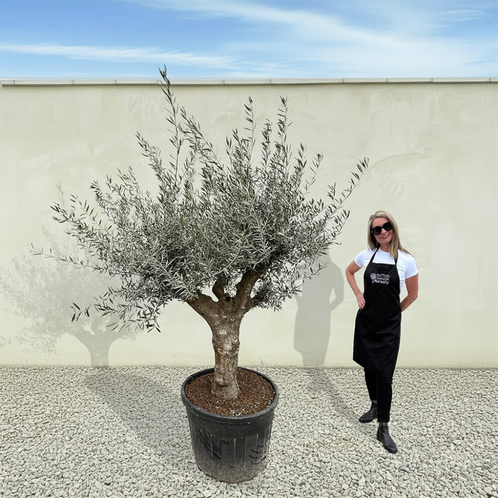 The tree shown in the photo is the exact tree you’ll receive on delivery day. Hand‑selected by the owner of Sutton Manor, this stunning Spanish olive tree was chosen for its exceptionally thick trunk and impressive, full crown. It makes a striking statement whether planted directly into the ground or showcased in one of our elegant pots.