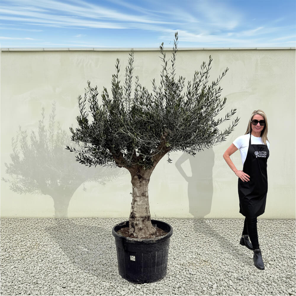 The tree shown in the photo is the exact tree you’ll receive on delivery day. Hand‑selected by the owner of Sutton Manor, this stunning Spanish olive tree was chosen for its exceptionally thick trunk and impressive, full crown. It makes a striking statement whether planted directly into the ground or showcased in one of our elegant pots.