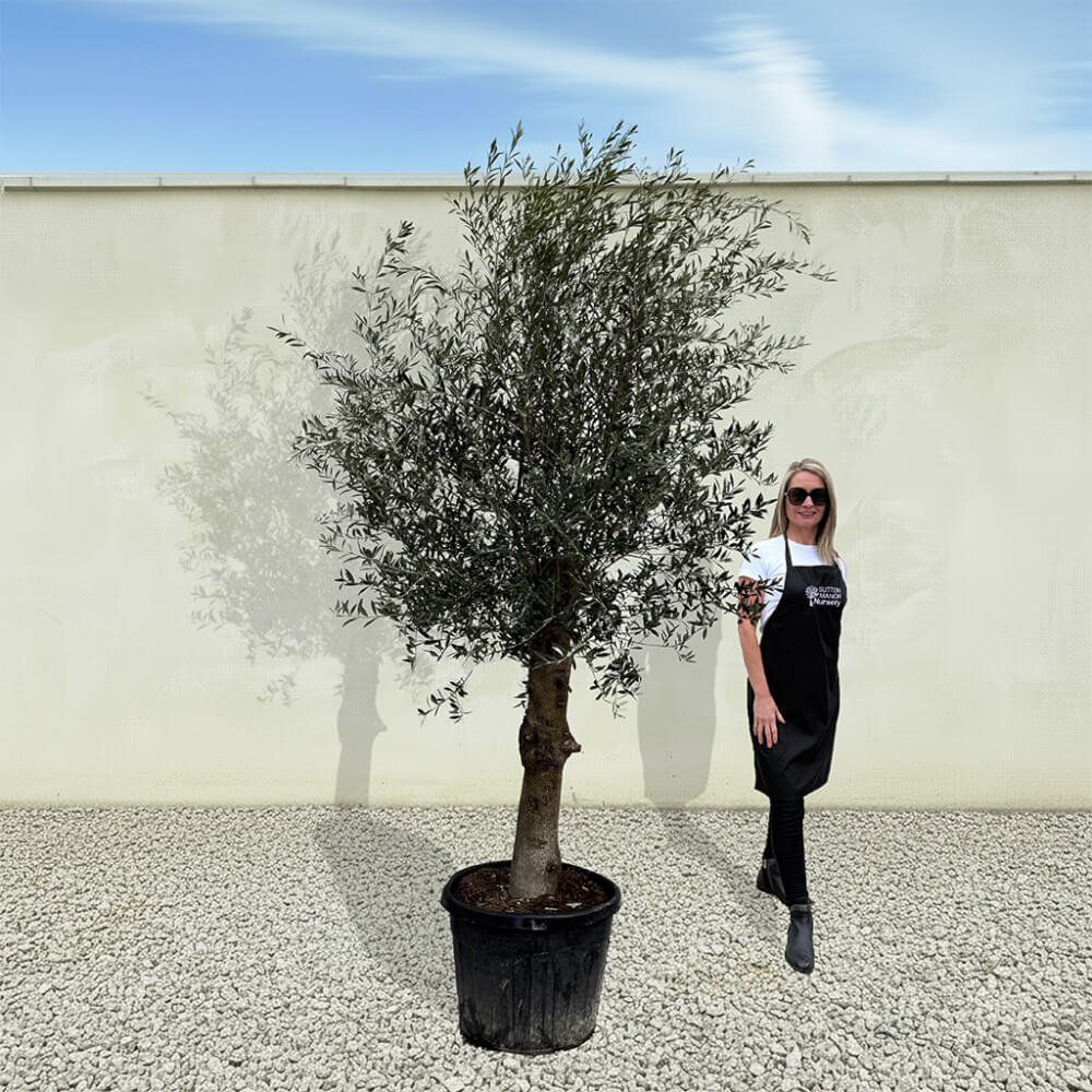 The tree shown in the photo is the exact tree you’ll receive on delivery day. Hand‑selected by the owner of Sutton Manor, this stunning Spanish olive tree was chosen for its exceptionally thick trunk and impressive, full crown. It makes a striking statement whether planted directly into the ground or showcased in one of our elegant pots.
