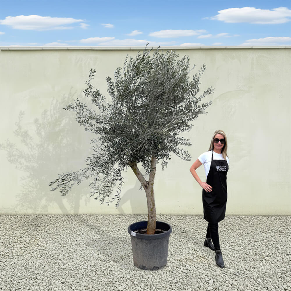 The tree shown in the photo is the exact tree you’ll receive on delivery day. Hand‑selected by the owner of Sutton Manor, this stunning Spanish olive tree was chosen for its exceptionally thick trunk and impressive, full crown. It makes a striking statement whether planted directly into the ground or showcased in one of our elegant pots.