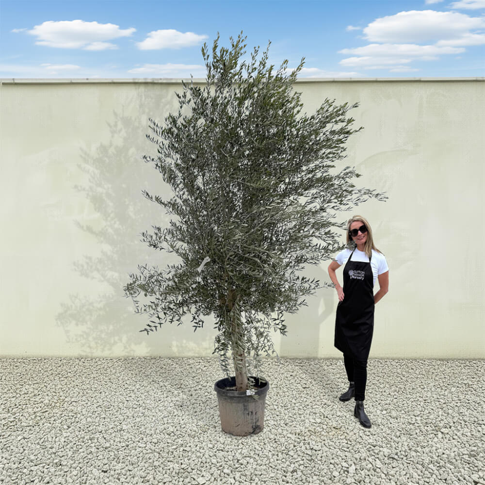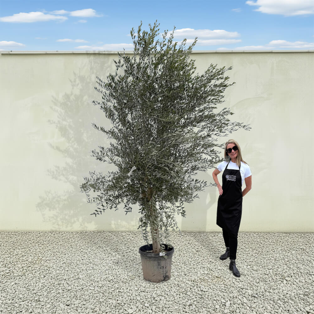 The tree shown in the photo is the exact tree you’ll receive on delivery day. Hand‑selected by the owner of Sutton Manor, this stunning Spanish olive tree was chosen for its exceptionally thick trunk and impressive, full crown. It makes a striking statement whether planted directly into the ground or showcased in one of our elegant pots.