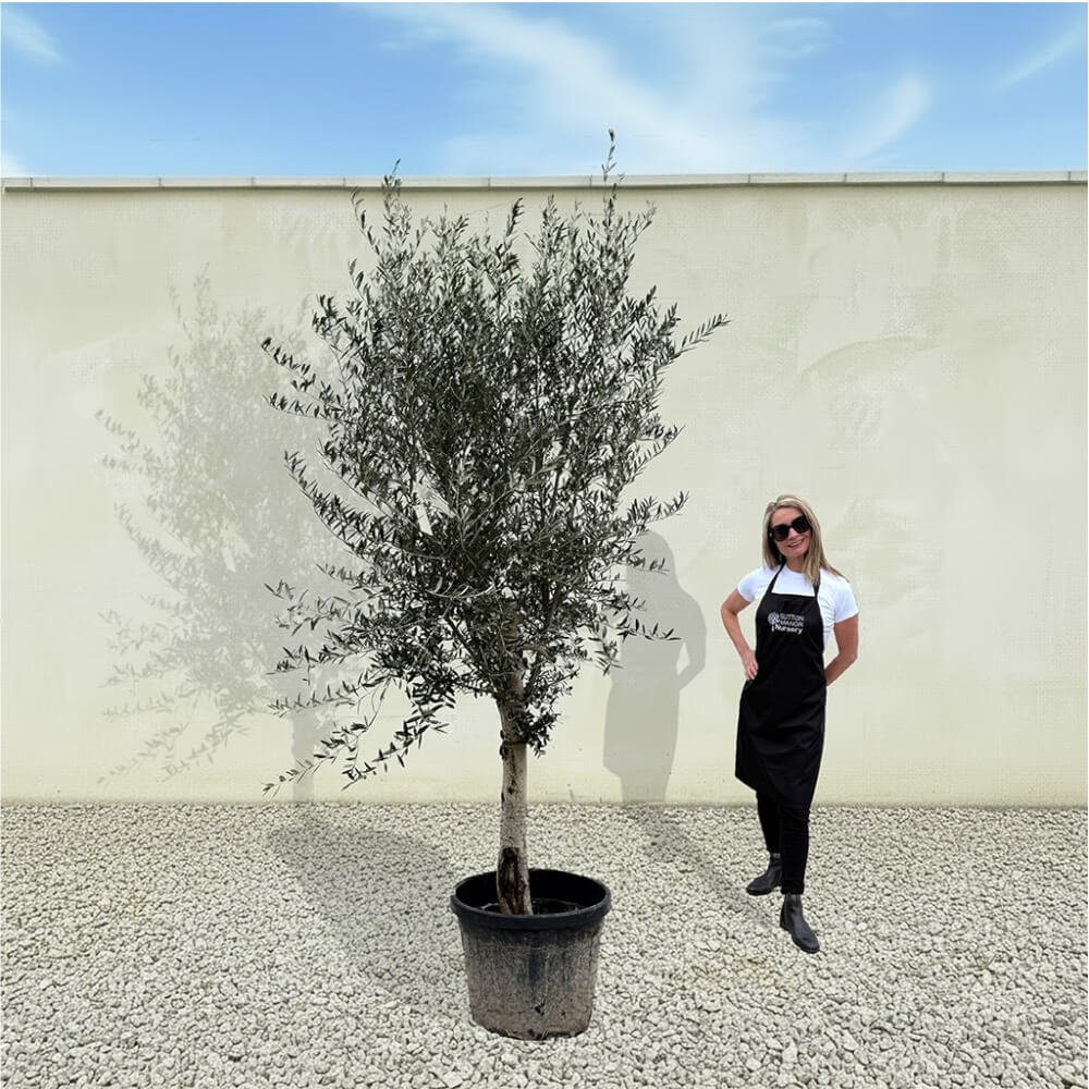 The tree shown in the photo is the exact tree you’ll receive on delivery day. Hand‑selected by the owner of Sutton Manor, this stunning Spanish olive tree was chosen for its exceptionally thick trunk and impressive, full crown. It makes a striking statement whether planted directly into the ground or showcased in one of our elegant pots.