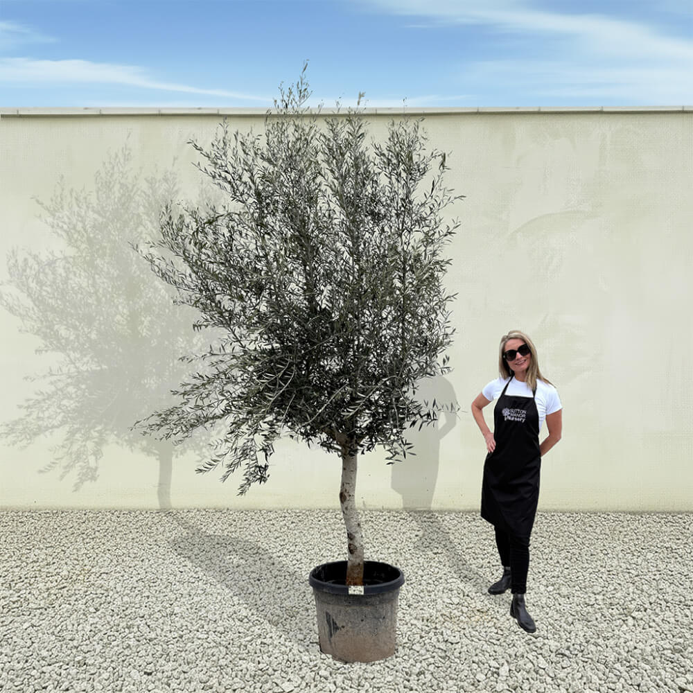 The tree shown in the photo is the exact tree you’ll receive on delivery day. Hand‑selected by the owner of Sutton Manor, this stunning Spanish olive tree was chosen for its exceptionally thick trunk and impressive, full crown. It makes a striking statement whether planted directly into the ground or showcased in one of our elegant pots.