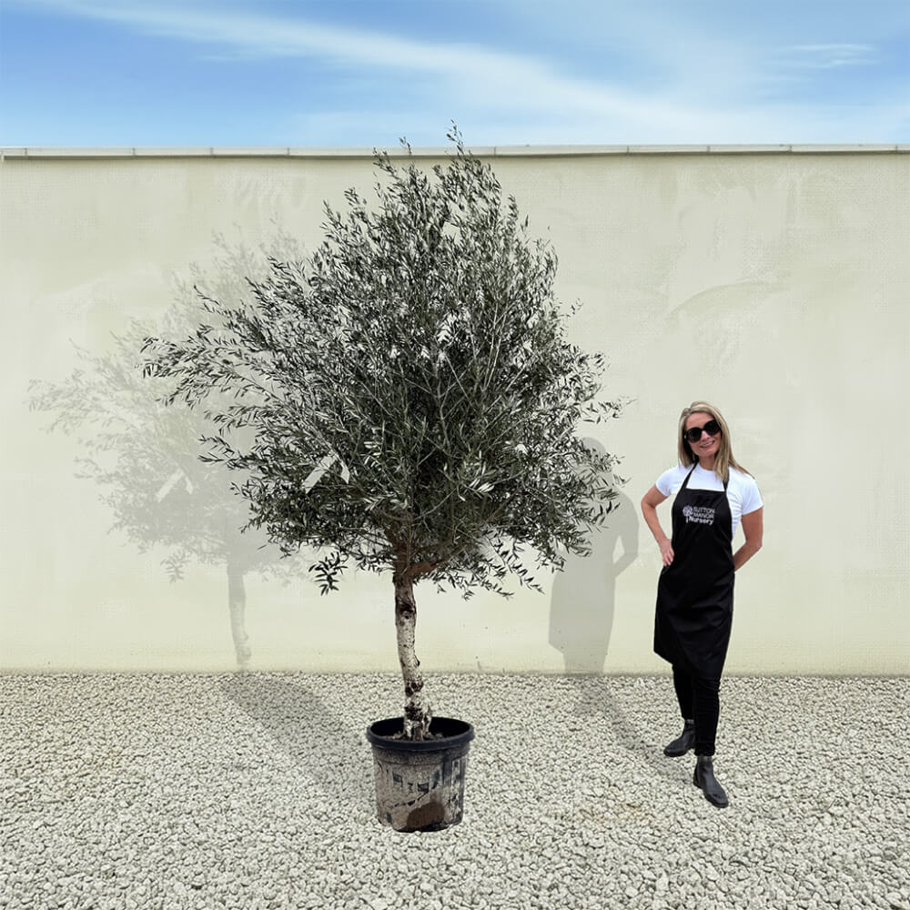 The tree shown in the photo is the exact tree you’ll receive on delivery day. Hand‑selected by the owner of Sutton Manor, this stunning Spanish olive tree was chosen for its exceptionally thick trunk and impressive, full crown. It makes a striking statement whether planted directly into the ground or showcased in one of our elegant pots.