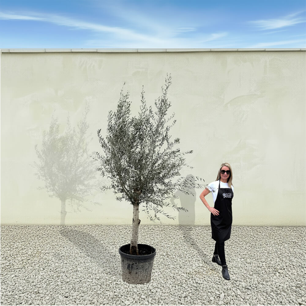 The tree shown in the photo is the exact tree you’ll receive on delivery day. Hand‑selected by the owner of Sutton Manor, this stunning Spanish olive tree was chosen for its exceptionally thick trunk and impressive, full crown. It makes a striking statement whether planted directly into the ground or showcased in one of our elegant pots.