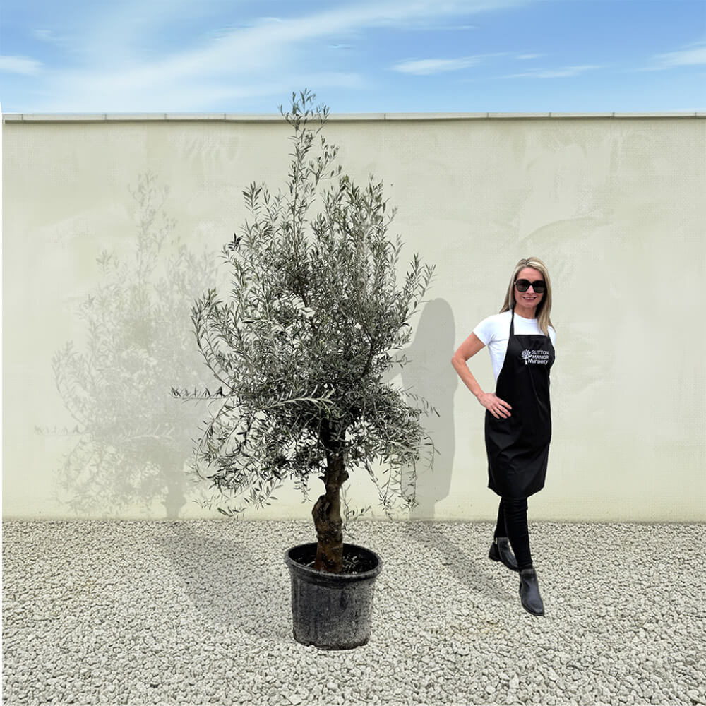 The tree shown in the photo is the exact tree you’ll receive on delivery day. Hand‑selected by the owner of Sutton Manor, this stunning Spanish olive tree was chosen for its exceptionally thick trunk and impressive, full crown. It makes a striking statement whether planted directly into the ground or showcased in one of our elegant pots.