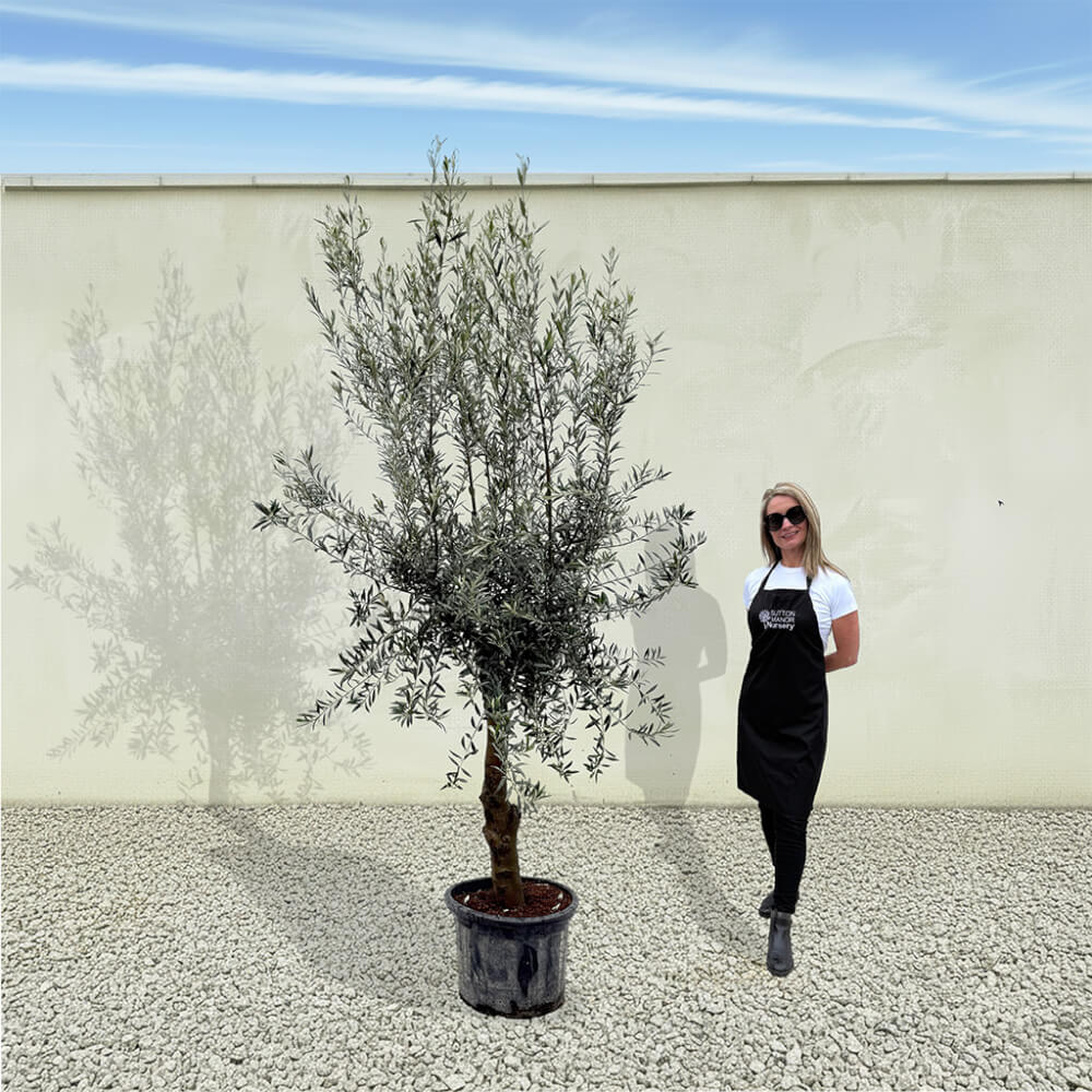 The tree shown in the photo is the exact tree you’ll receive on delivery day. Hand‑selected by the owner of Sutton Manor, this stunning Spanish olive tree was chosen for its exceptionally thick trunk and impressive, full crown. It makes a striking statement whether planted directly into the ground or showcased in one of our elegant pots.