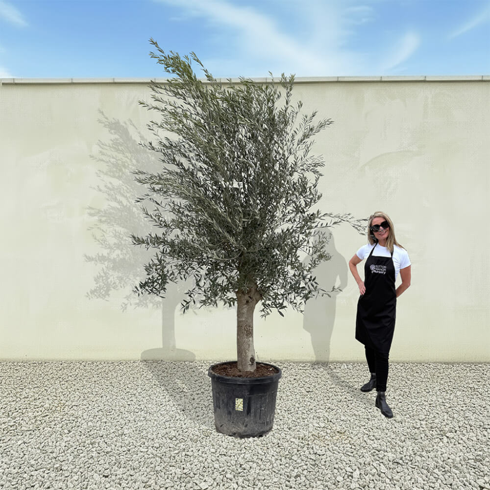 The tree shown in the photo is the exact tree you’ll receive on delivery day. Hand‑selected by the owner of Sutton Manor, this stunning Spanish olive tree was chosen for its exceptionally thick trunk and impressive, full crown. It makes a striking statement whether planted directly into the ground or showcased in one of our elegant pots.
