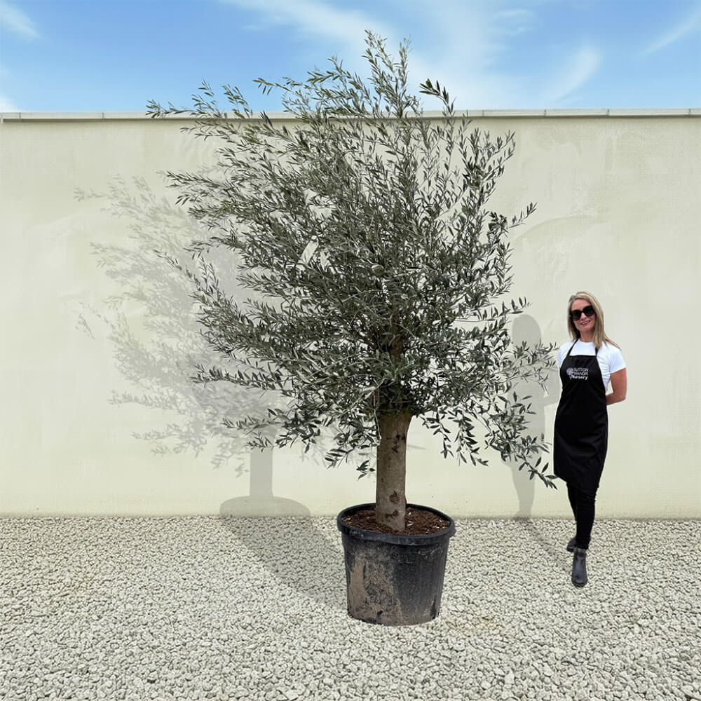 The tree shown in the photo is the exact tree you’ll receive on delivery day. Hand‑selected by the owner of Sutton Manor, this stunning Spanish olive tree was chosen for its exceptionally thick trunk and impressive, full crown. It makes a striking statement whether planted directly into the ground or showcased in one of our elegant pots.