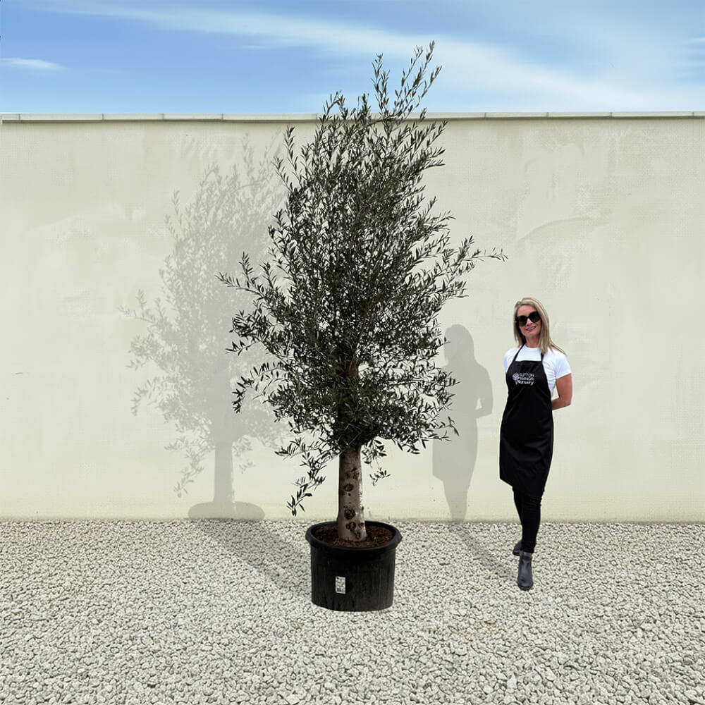 The tree shown in the photo is the exact tree you’ll receive on delivery day. Hand‑selected by the owner of Sutton Manor, this stunning Spanish olive tree was chosen for its exceptionally thick trunk and impressive, full crown. It makes a striking statement whether planted directly into the ground or showcased in one of our elegant pots.
