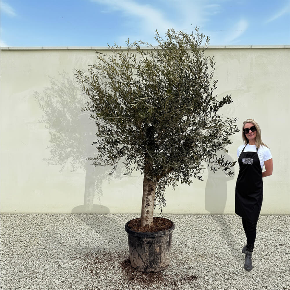 The tree shown in the photo is the exact tree you’ll receive on delivery day. Hand‑selected by the owner of Sutton Manor, this stunning Spanish olive tree was chosen for its exceptionally thick trunk and impressive, full crown. It makes a striking statement whether planted directly into the ground or showcased in one of our elegant pots.
