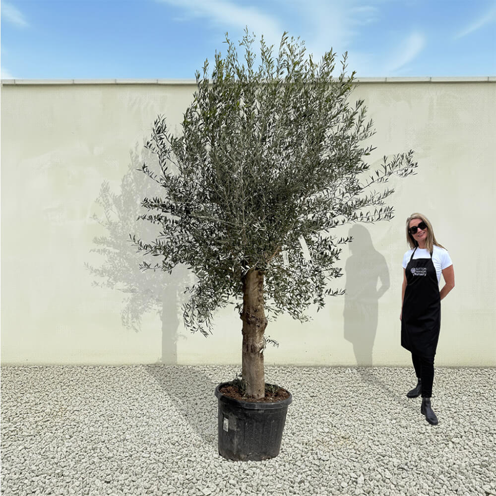 The tree shown in the photo is the exact tree you’ll receive on delivery day. Hand‑selected by the owner of Sutton Manor, this stunning Spanish olive tree was chosen for its exceptionally thick trunk and impressive, full crown. It makes a striking statement whether planted directly into the ground or showcased in one of our elegant pots.