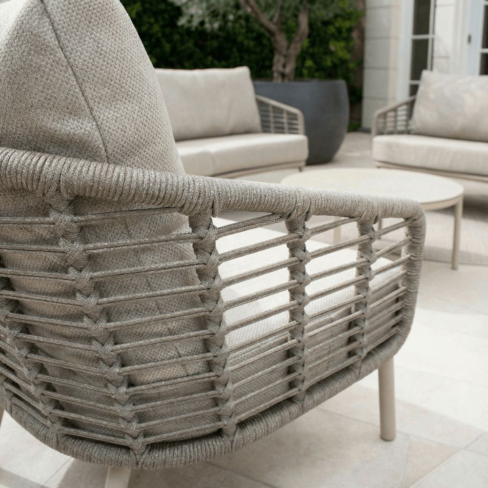 Our hand‑woven rope detailing is crafted by skilled artisans using specialist knotting techniques to form a beautiful, durable furniture framework. The rope is low‑maintenance and can be refreshed once a year with warm, soapy water for effortless care. For added peace of mind, each piece carries a minimum 10‑year warranty when left outdoors year‑round. To protect your garden set during autumn and winter—especially if stored beneath trees—use our protective covers to prevent fallen leaves, mud, and animal droppings from accumulating and lengthening spring clean‑up time.